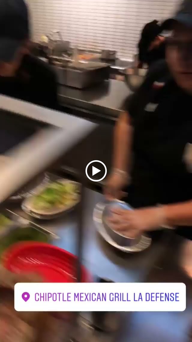 Tu as envie d'observer le travail à la chaîne viens chez Chipotle ! Je sais pas si c'est partout pareil mais à la Défense c'est une sacrée turbine ! La file d'attente était interminable il y avait bien 20 personnes devant moi (de quoi rebrousser chemin mais les avis semblaient dire que ça allait vite) et je n'ai attendu que 5 minutes avant d'être servie. La dernière fois que j'ai mangé un burrito c'était aux Etats-Unis, j'avais 17 ans et j'en garde encore un bon souvenir tellement c'était bon ! Je ne m'attendais pas du tout donc en allant chez Chipotle à retrouver ce genre d'émotion, c'est un fast food qui décline exactement les mêmes produits dans différents formats (salade, burrito, tacos). C'est pas du tout mon genre d'endroits mais bon parfois on a envie d'un gros truc un peu consistant qui réconforte (ahah pardon n'aies pas l'esprit mal placé !). J'ai pris un burrito, je ne sais même plus à quoi, tellement l'usine, pardon le service, est expéditif. Mieux vaut connaitre la carte sur le bout des doigts sinon ton burrito est déjà emballé et à la caisse avant que t'aies eu le temps de dire un truc. Pour finir c'est très cher. Plus de 9€ pour ça et vu qu'ils en vendent minimum 4 par minute fais le calcul !