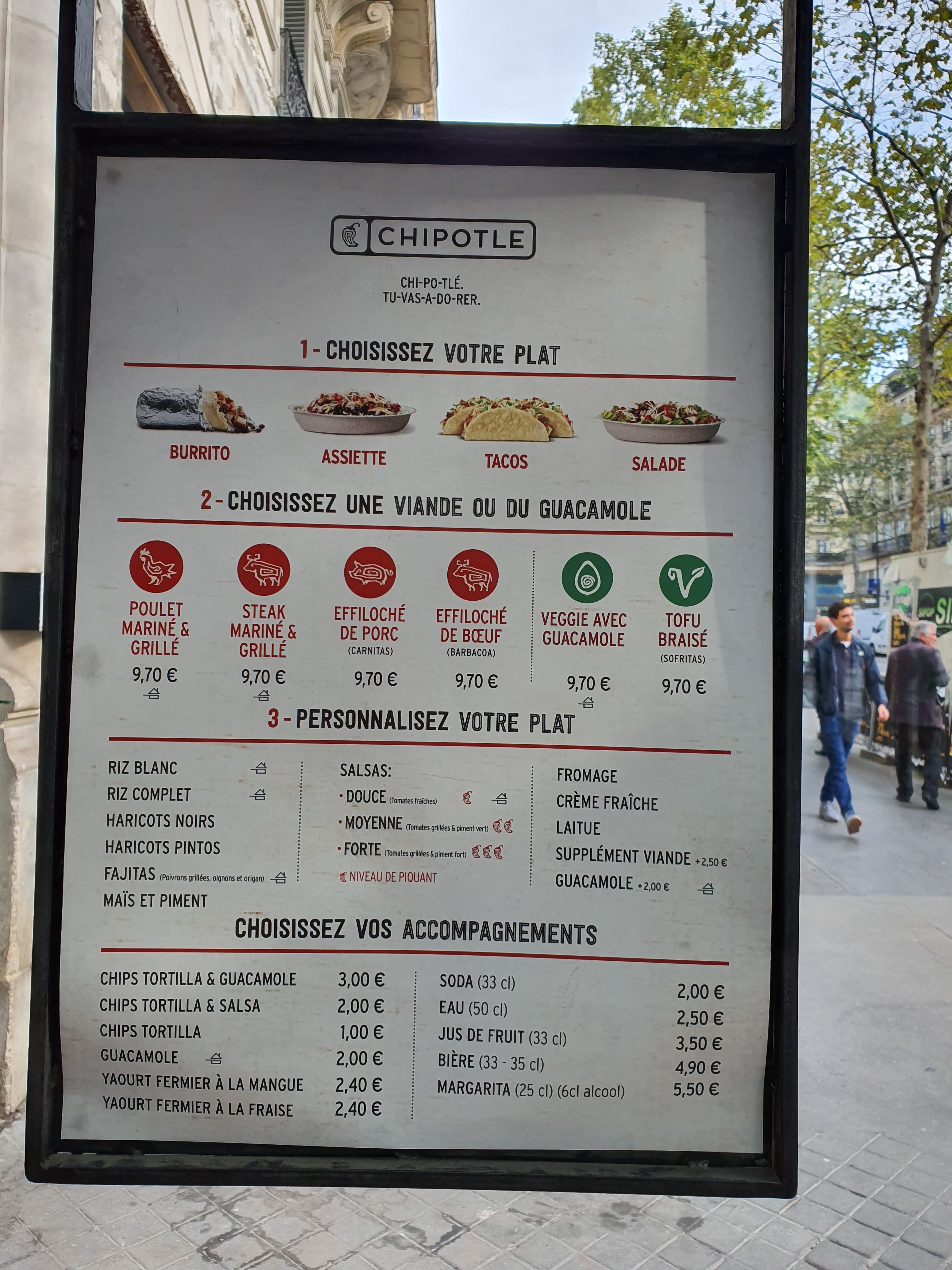 Posté le 07/01/2025 à 19:00"Bien que je sois américain, c'était la première fois que je mangeais du Chipotle. J'ai adoré le fait qu'il y ait de la sauce Tabasco. Je n'ai jamais mangé au Chipotle aux États-Unis à cause de ses prix élevés pour les petites portions, même si les prix sont moins chers que dans les magasins américains, c'est cher pour un seul burrito même pour Paris. le guacamole était bon, mais je ne paierais pas 3,45 € pour l'ajouter à mon burrito déjà à 10 € . Même si les portions étaient assez grandes, j'ai toujours l'impression que c'était un peu trop cher. J'ai adoré la qualité du bœuf. Le personnel était serviable et sympathique et parlait également anglais. Bien qu'il ne soit pas accessible aux fauteuils roulants ou aux poussettes."