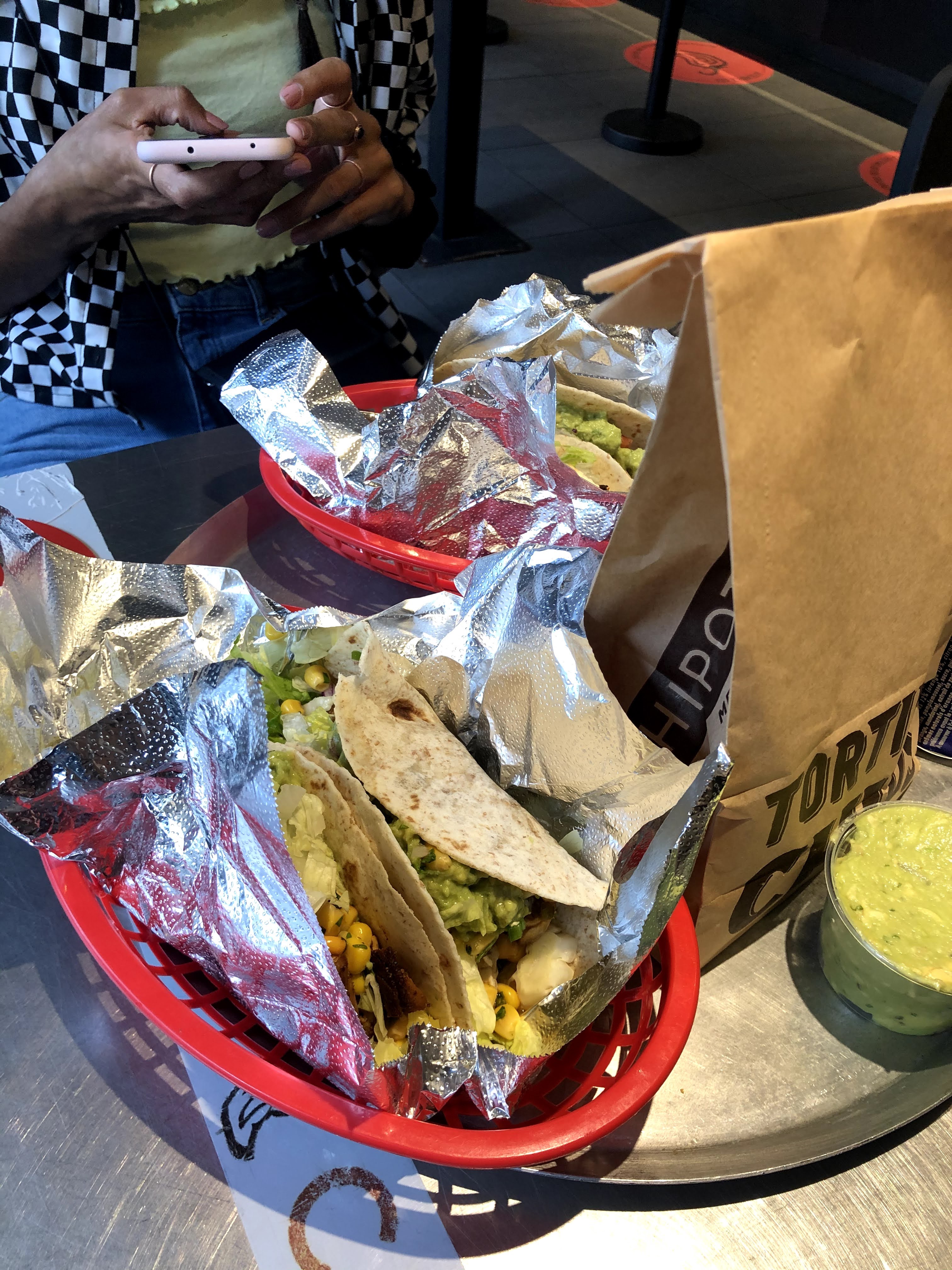 Repas très chargé. Il y a de quoi nourrir tout un bataillon. Ça manque cruellement de finesse. Même pour un fast food, c'est vraiment lourd. Pour le reste, j'ai pris des tacos végétariens qu'on voit sur la photo. Impossible de les prendre en main sans que la moitié ne tombe à côté. Les saveurs sont pas mal mais on est définitivement loin d'un incroyable moment culinaire.