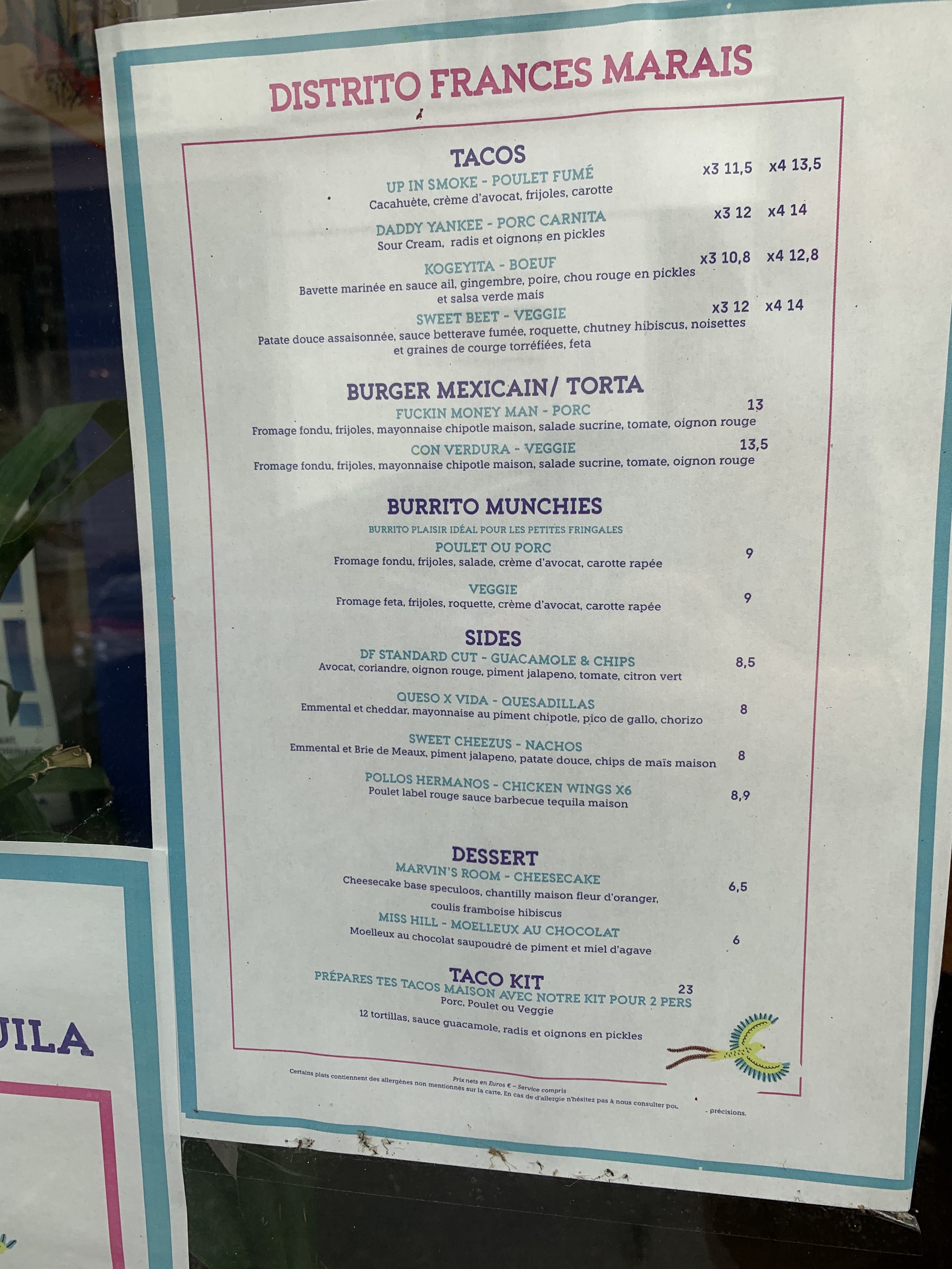 Hello Michael Un grand merci pour cet avis plein d'étoiles! On espère que vous avez passé un moment agréable en notre compagnie et que vous avez pu dégusté nos super burritos, nos tacos sans gluten et nos autres spécialités mexicaines à partager! On espère vous accueillir très vite dans notre cantine mexicaine du Marais (Paris 3, Métro Saint Sebastien Froissard)! L'équipe Distrito Francés Marais!