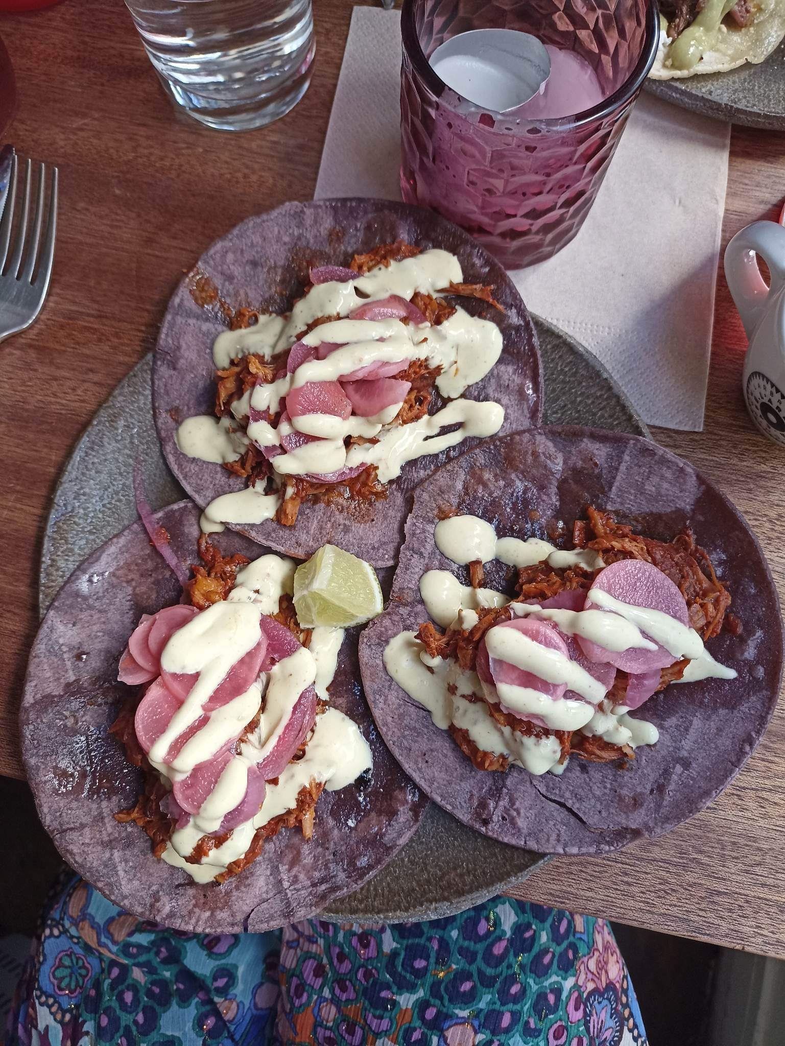 Posté le 07/08/2017 à 07:02"Quel bel endroit, que de bons tacos. Difficile, je pense, de trouver de meilleurs tacos à Paris, vrais tacos à la mexicaine. Tortillas de maïs bleu, viande de porc juteuse ou poulet, goûts joliment assemblés : magnifique ! Le cadre est aussi tranquille et sympathique, le service détendu - très belle expérience !"
