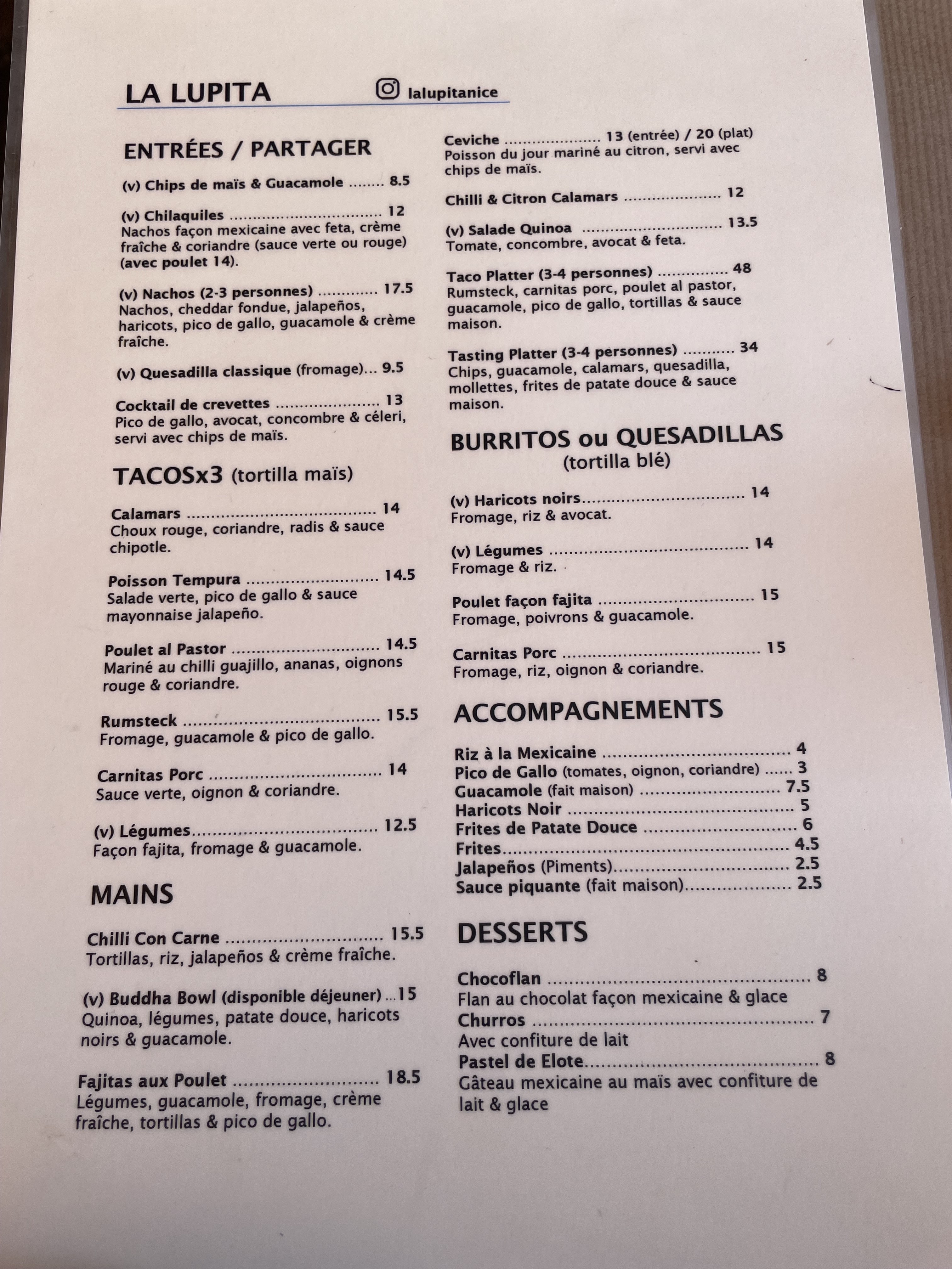 Posté le 18/02/2024 à 18:00"Après avoir tourné pendant une heure l’après midi d’un samedi de carneval de Nice, mon amie et moi nous nous sommes presque résilié à manger dans n’importe quel restaurant juste pour combler notre faim. Malheureusement peu nombreux sont les restaurants qui travaillent en continue surtout en février! Attention on ne rigole pas avec la bouffe et on mange pas n’importe où donc on cherchais un endroit bon et bien avec des plats de qualités, valeurs… du respect pour l’aliment et pour le client quoi! Ce petit restaurant est apparu comme une lumière à la fin d’un tunnel: Cuisine authentique mexicaine avec des Saveurs, du choix, de la fraîcheur!, générosité, authenticité, service très bien (peu d’attente, écoute et gentillesse). De plus le restaurant est très bien situé dans un quartier central non loin de la cours Saleya et les prix sont carrément honnêtes ! Merci et au plaisir on vous souhaite de continuer et prospérer !"