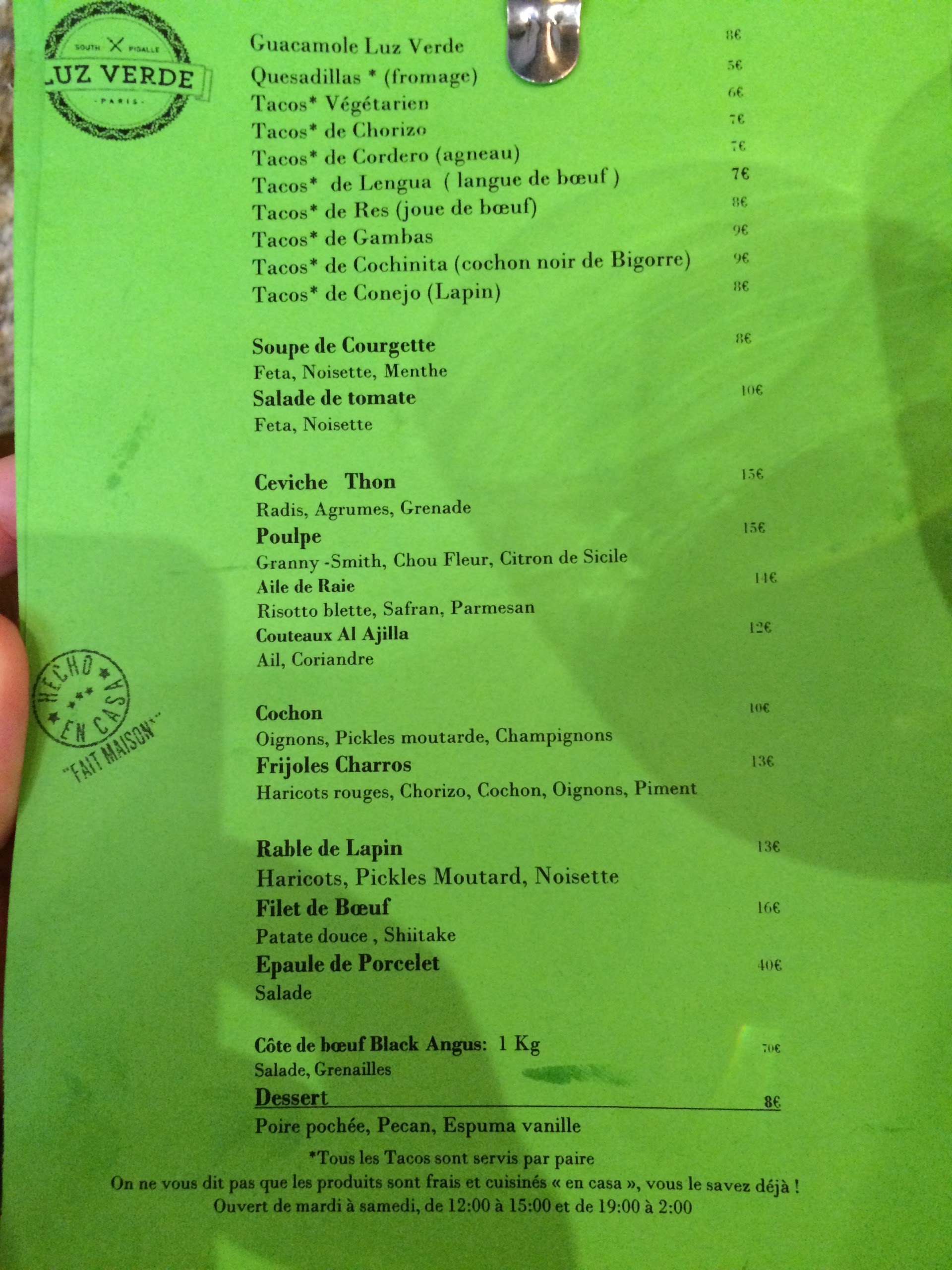 Posté le 16/08/2015 à 20:45"Rien que pour le Guacamole, il faut faire un détour par Luz Verde ! Pour ce qui est des tacos, ils sont très bons, mais pas incroyable non plus, une préférence certaines pour le tacos chorizo. Concernant les boissons, on aurait aimé voir une plus grande sélection de bières mexicaines. Attention à la forte affluence le soir, on nous fait comprendre (avec un grand sourire), qu'il ne faut pas trop traîner pour que tout le monde puisse s'asseoir."