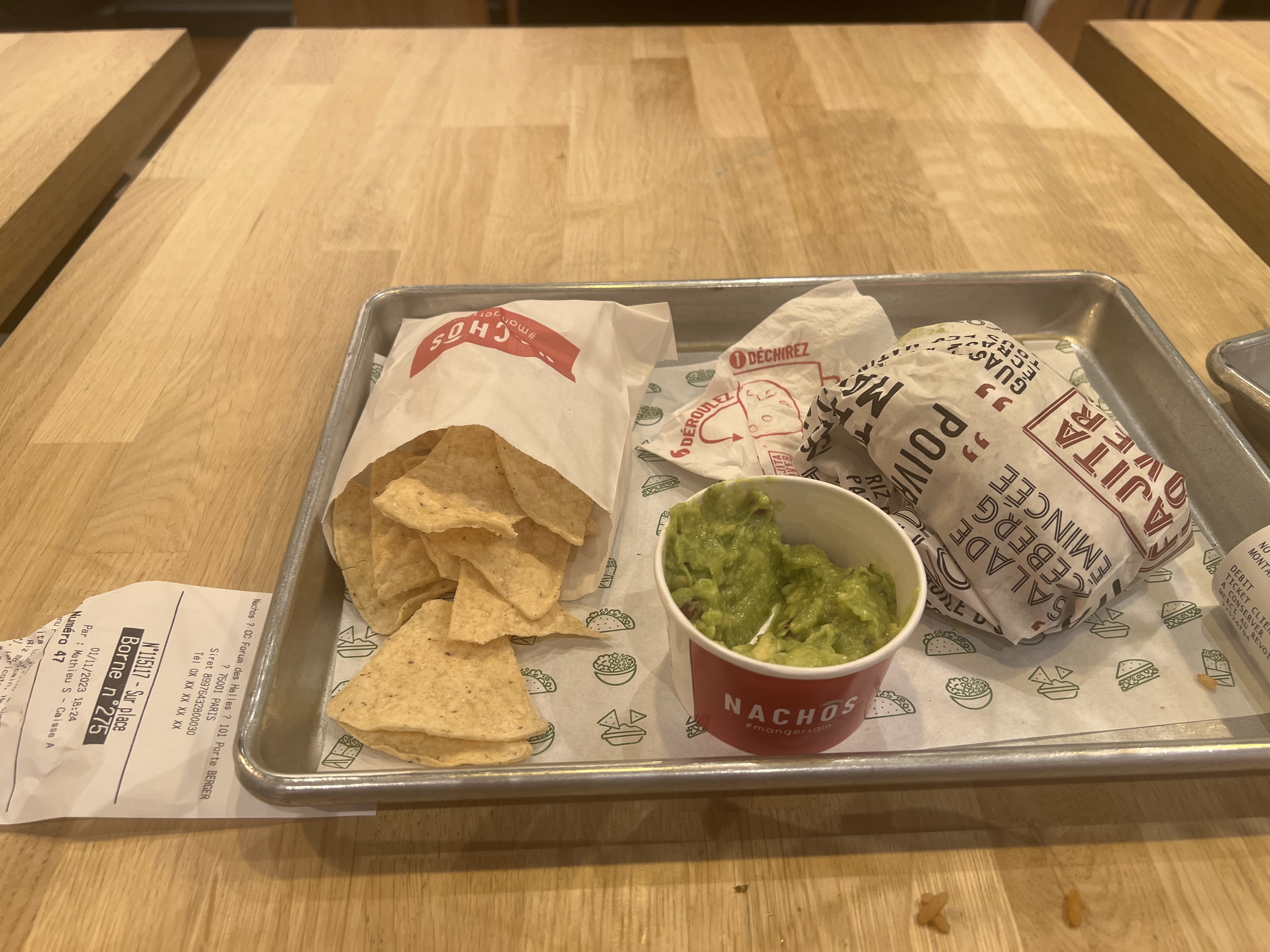 Posté le 07/01/2025 à 18:19"C’est un fast-food simple comme on en voit souvent. Pour ceux et celles qui aiment les fast-food mexicain vous allez trouver votre bonheur avec les différents sandwiches et pock proposés Ne vous attendez pas à une grande cuisine Se sont des sandwiches fait dans des galettes avec différents toping bien assaisonnés Parfaits pour les petite faim Mais attention qui dit tendances dit prix élevé Le menue est à 9,80€ pour une petite faim (je précise…) Moi je n’ai pas plus que ça aimé car je juge que la quantité du riz dépasse largement la quantité dû poulet comme c’est mentionné, j’aurais renommé fagitas au riz et non au poulet🥲 Je le conseil donc pour les petit jeune adolescent pour une sortie entre amis ! Si vous souhaitez continuer l’expérience et vous divertir un grand cinéma UGC,une piscine olympique, une grande bibliothèque (spécialisée dans le cinéma) ainsi que le centre commercial Westfield se trouve à quelques mètres du Nachos Pour la digestion un grand parc (jardin) de l’église saint eustach et le monument de la bourse de paris se trouve au dessus du restaurant en empruntant les Escalators de gauches Pour y accéder rien de plus simple d’y aller en transports en commun RER (A/B/D) métro (1/4/7/11/14) station Charlet /chatlet les hall"