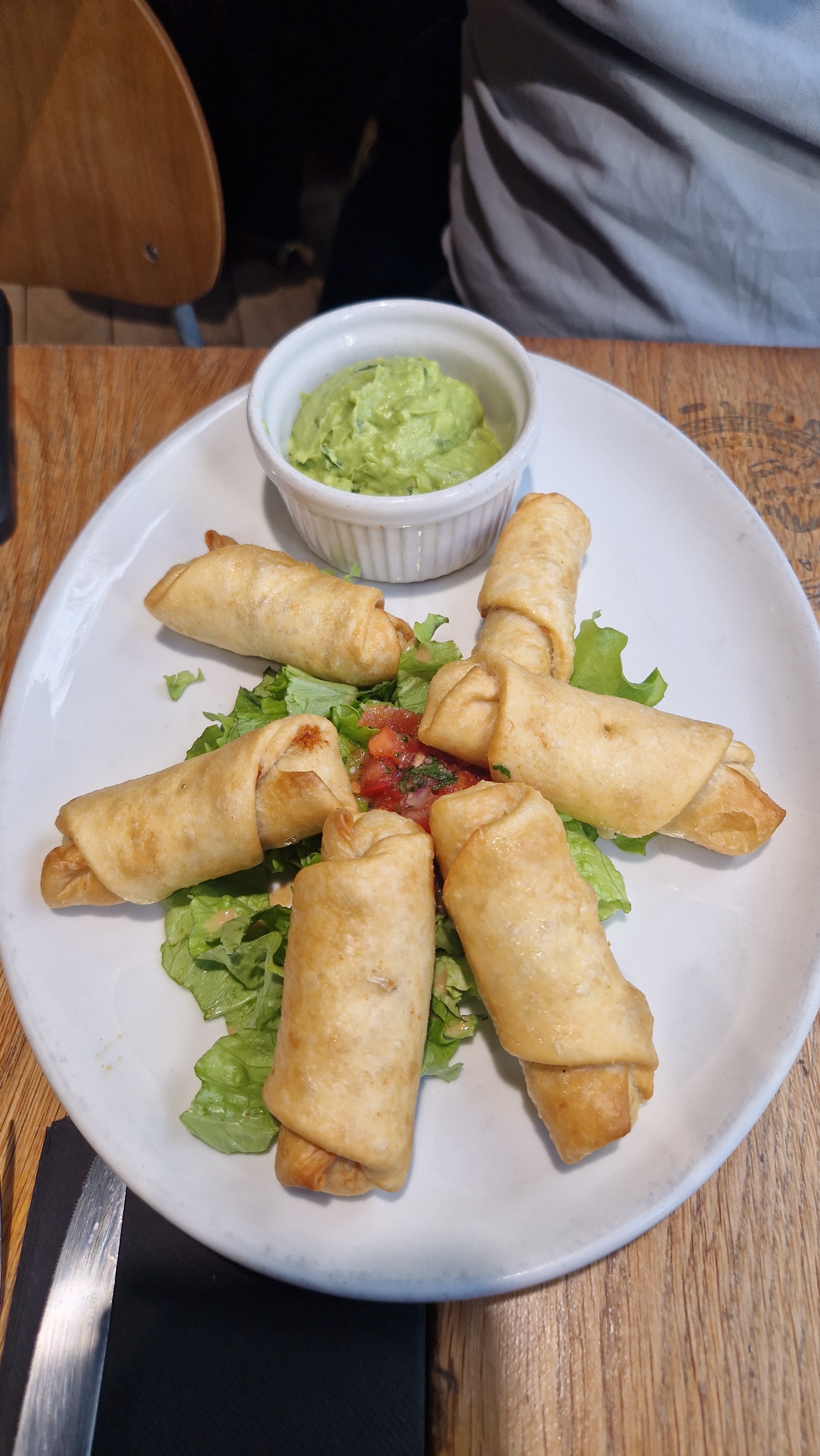 Posté le 30/12/2023 à 20:28"Des burritos qui ne doivent pas être le highlight de la carte au vu de leur absence de goût... un amas de riz, des haricots noirs, une viande très cuite sans assaisonnement distinctif (le boeuf a le meme gout que le porc), dans une galette aspergée d'une sauce (tomate ?) et de fromage fondu. Pas de cruditites, pas de sauce, ca ne sent rien. Finalement, le meilleur dans cette assiette de burrito c'est la salade verte à coté qui est tres abondante."